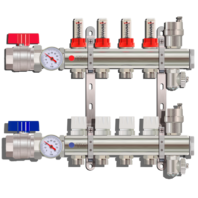 Коллекторная группа служит для распределения потоков (теплоносителя или воды) по контурам теплого пола с максимальной рабочей температурой 70°C, с рабочим давлением до 6 bar.